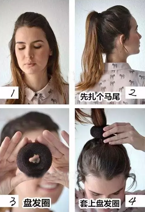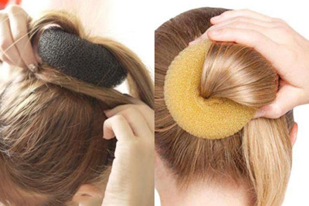 套盘发器:将甜甜圈盘发器套住束起的秀发,一压到底。将头发像花朵般从中心均匀地展开。